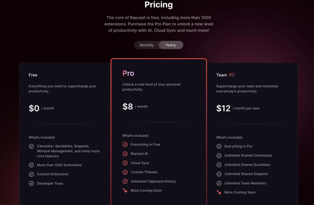 - Raycast: Powerful free tier with most features; Pro subscription adds AI, cloud sync, theming, and team features.